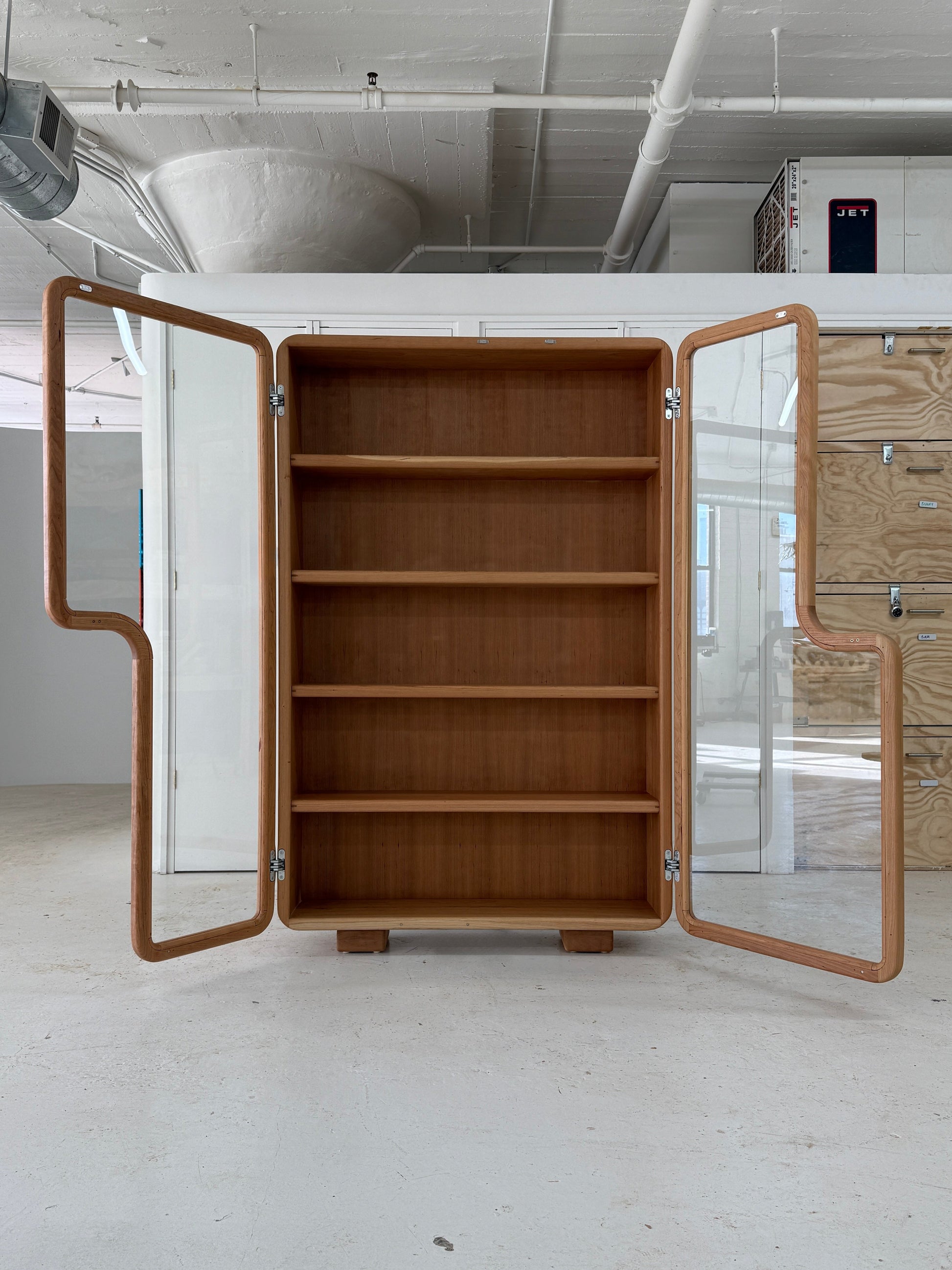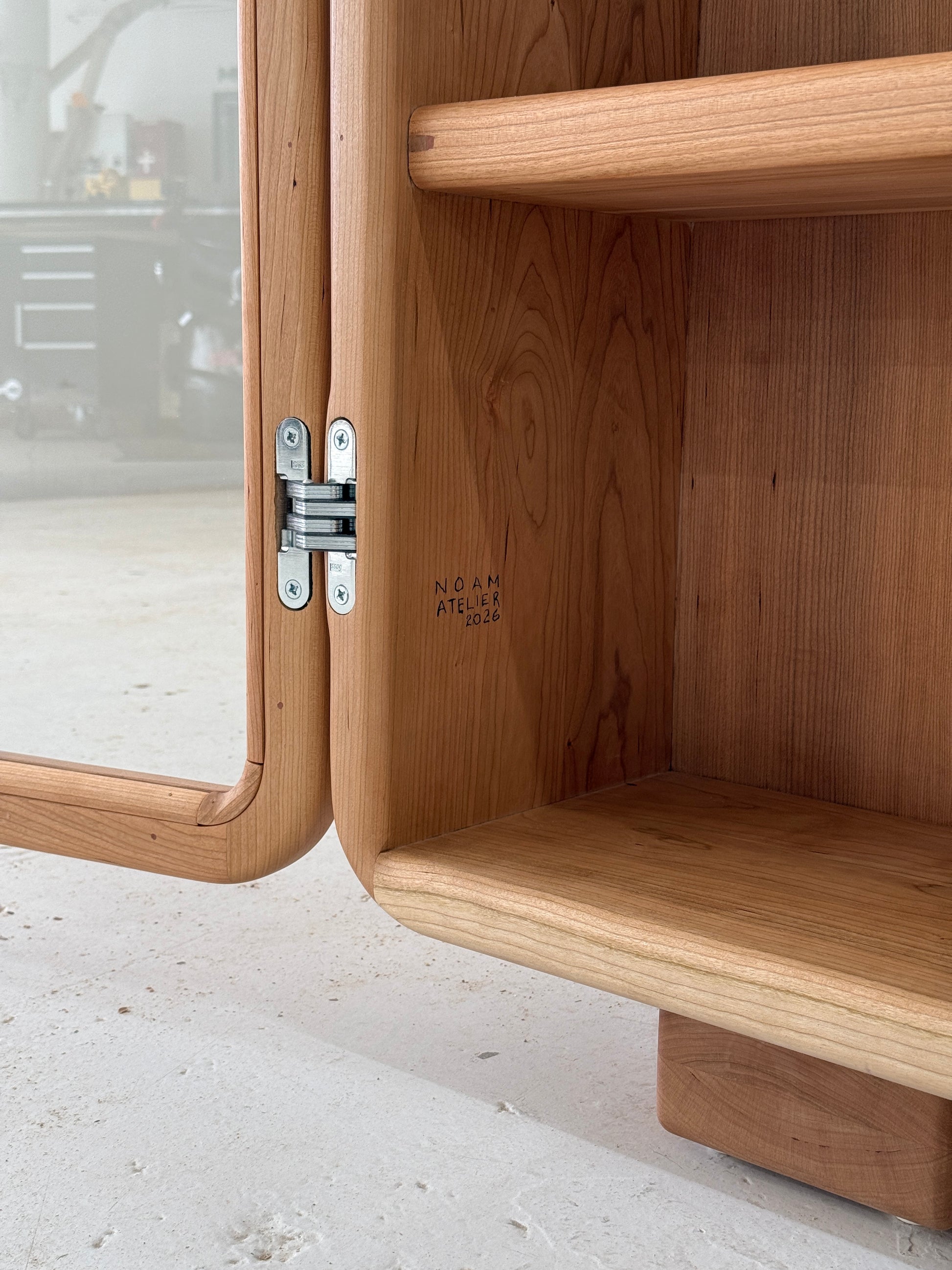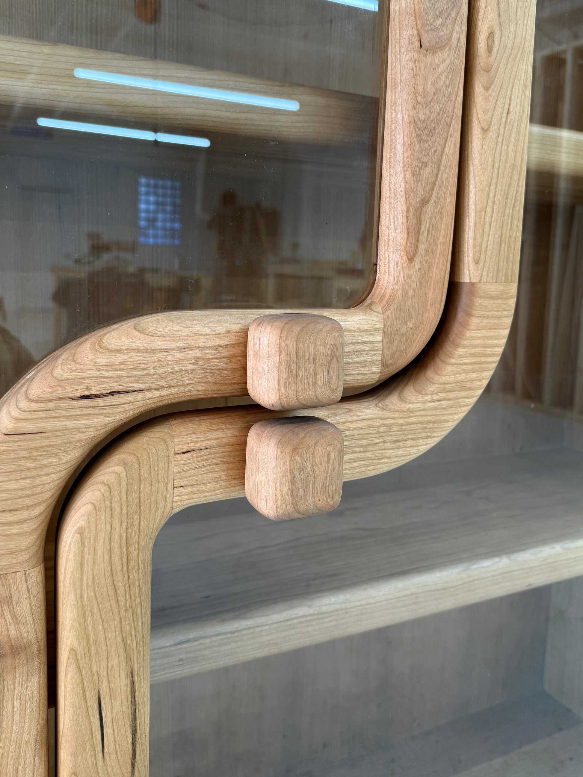The Toba Cabinet is a display cabinet handmade from cherry wood, featuring glass doors and inset chrome-plated hinges. Soft edges and playful curves create a sense of balance and beauty that set the piece apart in any environment. Built entirely from solid hardwood for heirloom quality, the cabinet can be wall-mounted with a concealed wooden cleat or used freestanding. Toba Cabinet is the perfect showcase for art objects, prized possessions, or as a focal point in any room.